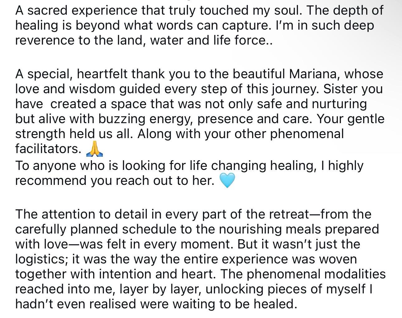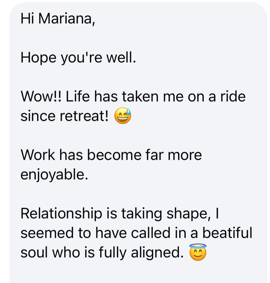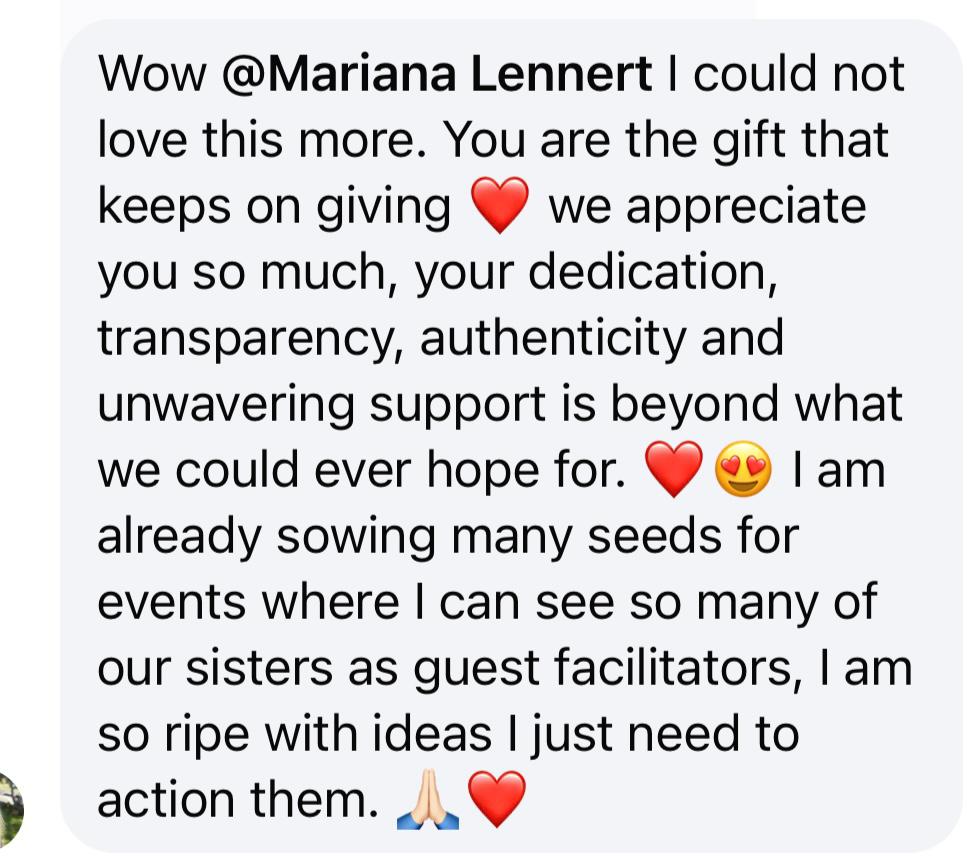 Today, Mariana is a speaker, mentor, and facilitator who has guided thousands of women across the globe through retreats, live events, and transformational programs. She is devoted to helping women reclaim their feminine power and create lives of deep joy, abundance, and sacred alignment.